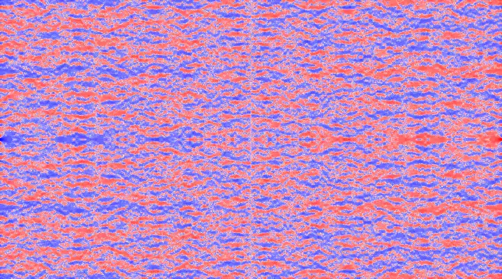 The video below shows the bounceScore at all locations, averaged over all angles, as \(w\) loops between 0 and \(s_x\), i.e. each pixel represents a particular location on the table. I rotated the table by 90 degrees because it fit better on the page that way. The color indicates which of the two goals the puck is likeliest to end up in, with blue indicating your goal, and red indicating your opponent’s goal. For visualization purposes, I raised the bounceScore to the power of 0.25 to increase the contrast, but that doesn’t affect the underlying pattern of blue and red regions.